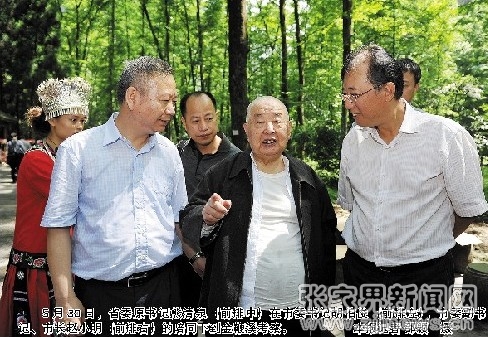 5月30日,省委原書記熊清泉(前中)在市委書記胡伯俊(前排左),市委副書記、市長趙小明(前排右)的陪同下到金鞭溪考察。