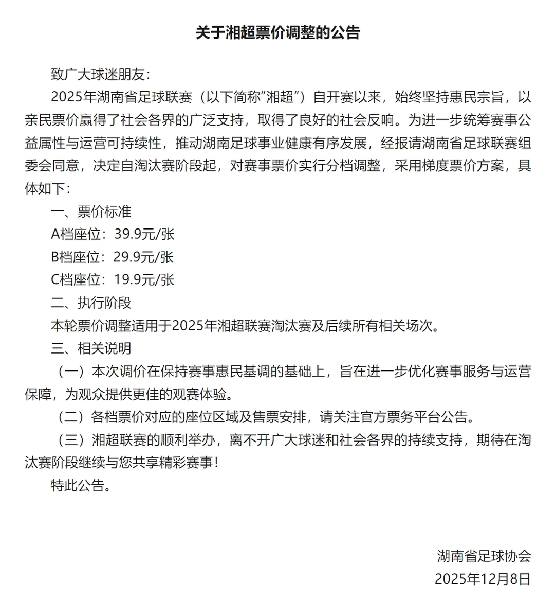 湖南日報·新湖南客戶端12月8日訊(記者 蔡矜宜)今天,湖南省足球協(xié)會發(fā)布《關(guān)于湘超票價調(diào)整的公告》(以下簡稱公告),自淘汰賽階段起,湘超票價實行分檔調(diào)整,分別為A檔39.9元/張、B檔29.9元/張、C檔19.9元/張。