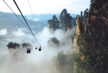 張家界國家森林公園天子山,索道穿行 在云霧繚繞的峰林間。 吳勇兵 攝